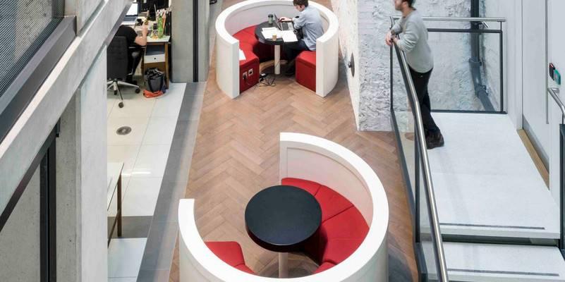 靈活的座椅位于每一層,定制粉紅皮箱設計,包在預制混凝土和胡桃木桌子旁邊的數據和電源連接點,為員工提供了“突破”的空間,但仍在辦公室內協同工作。