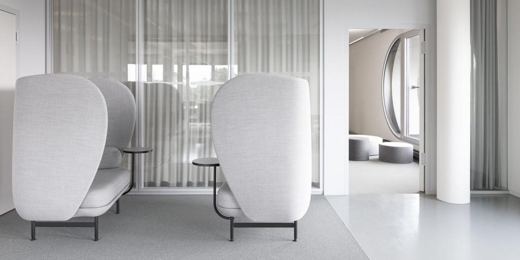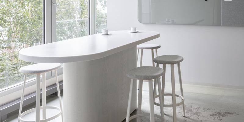 在接待處旁邊,還設立了一個等候區,里面有高背沙發;另外的椅子被分組,以便在大廳的另一部分提供一個更隱蔽的空間。這一部分的空間是四舍五入的技術移動,一個多功能的裝飾項目,可以用來展示一個變化范圍的鼓舞人心的技術展品。