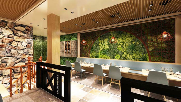 中式快餐店二樓餐區(qū)設(shè)計(jì):二樓餐區(qū)主要以4人桌、6人桌構(gòu)成,餐桌與餐桌之前可以拼湊,這樣既能滿足常規(guī)的需求,同時(shí)也能滿足非常規(guī)的需求,二樓的景色以綠色為主。