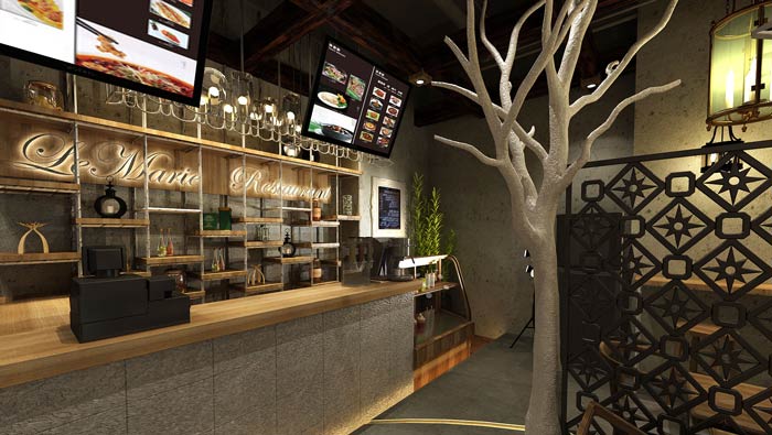 特色快餐店前臺裝修設(shè)計:既然是特色快餐廳,自然菜肴也是定制化的,不同的就是這里的上菜速度十分迅速,業(yè)主在速度、美味之間取得平衡,以此滿足客戶的需求。