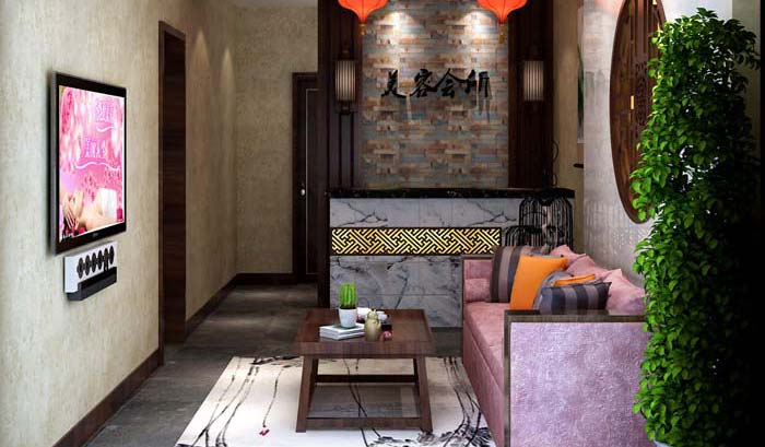 在前臺設計的時候,設計師在logo和背景墻上面大下工夫,在背景墻運用了燈光的效果,使得背景墻色彩迷人,前臺的設計利用了每一寸空間,設計師開發自己的想象,讓前臺井井有條,實現的功能一樣不少,在前臺的設計上面,實現更多的功能卻不顯得擁擠。