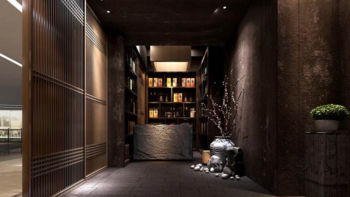 日式料理餐廳過道設(shè)計(jì):這里是連接前臺、內(nèi)部空間的過渡區(qū)域,空間的留白、簡潔延續(xù)了中式設(shè)計(jì)的特色,裝飾雖說不多,但是在整個(gè)空間中卻起到畫龍點(diǎn)睛的作用。