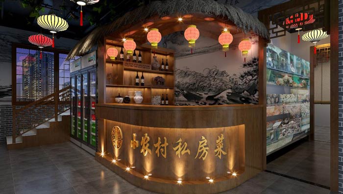 農家私房菜進門區設計:小農村私房菜,六個字給客戶以直觀的感受,鄉村樣式的柜臺、加上中式的元素,讓時間在這里慢了下來,讓客戶享受美食真正的味道。