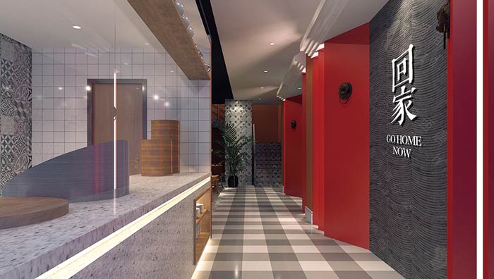 私房菜餐廳進(jìn)門過道設(shè)計(jì):此處是客戶進(jìn)入餐廳的必經(jīng)之道,回家兩個(gè)字預(yù)示著餐廳的服務(wù)宗旨,透明的廚房讓客戶,可以清楚的看到整個(gè)廚房的一舉一動(dòng),讓客戶吃的放心、安心。
