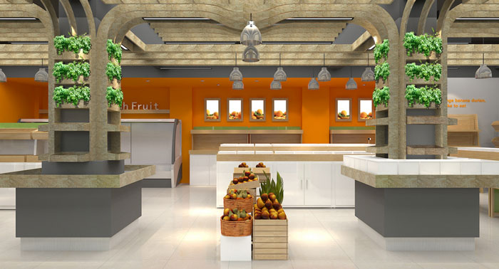 水果店裝修圖采用了自然的主調,配上店門花案式的造型讓顧客感受到了大自然的氣息,整個店面的造型就像一個綠化的保險柜,光看上去就給人一種放心的感覺,最到了顧客心里最喜歡的感受。