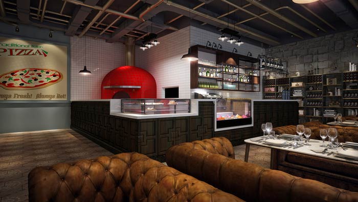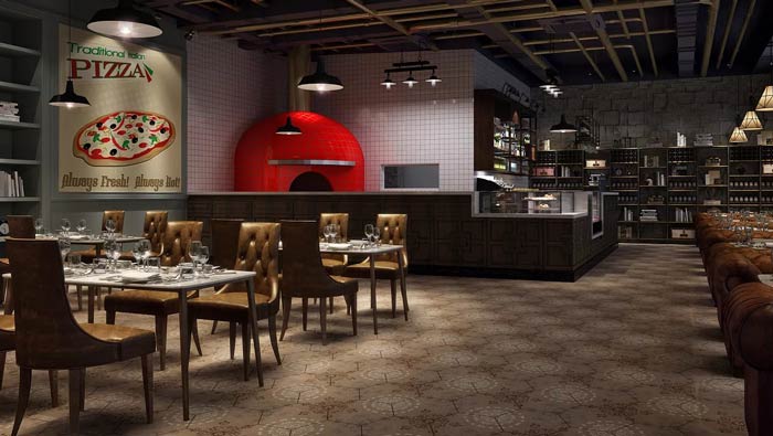披薩西餐廳餐區裝修設計:餐廳的內部空間采用純西式的設計,目的就是希望給客戶換一個場景,讓客戶可以見證不同的餐區氛圍,讓客戶在這里享受到地地道道的披薩。