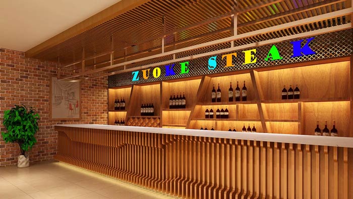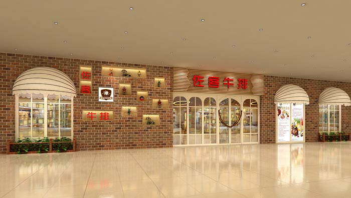 牛排西餐廳外立面裝修設計:牛排是餐廳的主打餐品,故此設計師在設計中,將牛排二字特意提出,目的就是在于強調餐廳的屬性,讓客戶知道這里的餐品是什么,而不是一概而論。