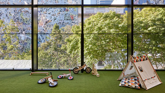 早教中心休息區設計:孩子都愛赤腳走路,故此設計師在休息區的設計中,沒有設置座椅,只是將草坪安置在其中,孩子在其中赤腳坐在那里休息,帳篷讓孩子在自然中休息。