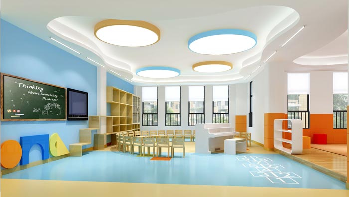 教室的設計:在這里最引人矚目的就是座椅的排列方式,這也是設計師偶然而來,設計師的目的就是希望減輕教師的負擔,同時也可以拉近彼此之前的關系,在這里沒有好、差之分,有的就是和平共處、快樂的成長,同時寓教于樂也是幼兒園的辦學宗旨。