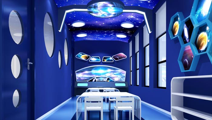 科幻教室的設計:在這里孩子們可以體驗太空的生活,這里完全都是仿真的設計,在這里孩子們感覺自己好像在遨游太空,在這里高科技離我們是那么的近,讓孩子見證自己的未來世界,讓孩子對未來充滿期待、憧憬,在設計師看來教育本來就不能與世界脫軌。