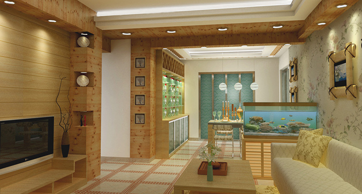 基調(diào)是豐收的金黃色,盡可能選用木、石、藤、竹、織物等天然材料裝飾。軟裝飾上常有藤制品,有綠色盆栽、瓷器、陶器等擺設。