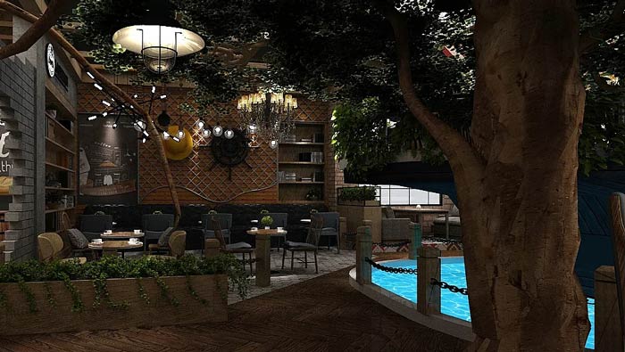 主題餐廳餐區設計:餐區圍繞水池分布,水池旁邊有樹、綠植,因為有水所以空間空氣格外清新,在這里就餐讓我們好似在露營,在大自然之中享受美食。
