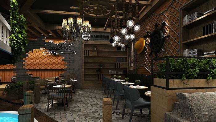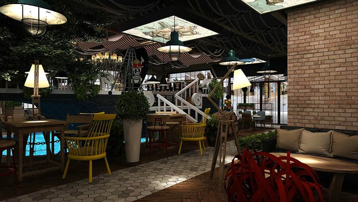 主題餐廳海盜船設計:船體漂浮在水面上,客戶在來回晃蕩的船體上就餐,讓客戶感受到在區別于陸地的感覺,空間的裝飾讓人感覺,好似回到了海賊王時代。